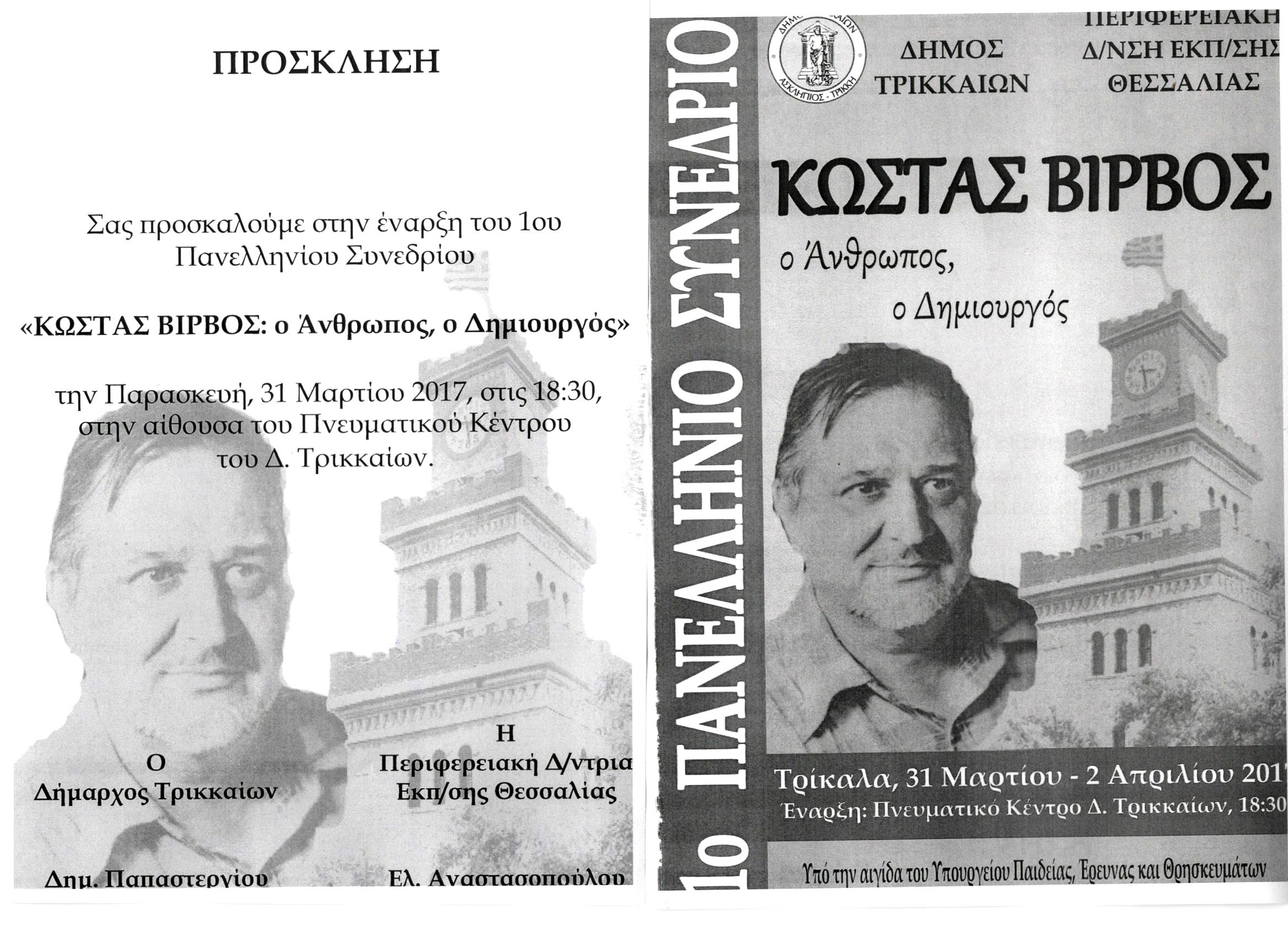 Η Περιφερειακή Διεύθυνση Εκπαίδευσης Θεσσαλίας και ο Δήμος Τρικκαίων διοργανώνουν το 1ο Πανελλήνιο Συνέδριο «Κώστας Βίρβος: ο Άνθρωπος, ο Δημιουργός», υπό την αιγίδα του Υπουργείου Παιδείας, Έρευνας και Θρησκευμάτων. Το συνέδριο διοργανώνεται με πρωτοβουλία της Διεύθυνσης Πρωτοβάθμιας Εκπαίδευσης Ν. Τρικάλων